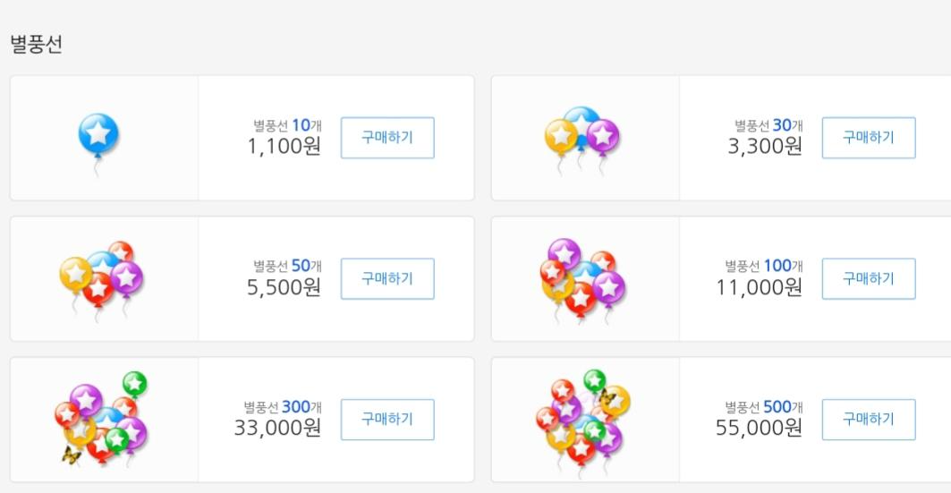 별풍선은 기본적으로 10개를 한 묶음으로 1,100원에 판매하고 있고,