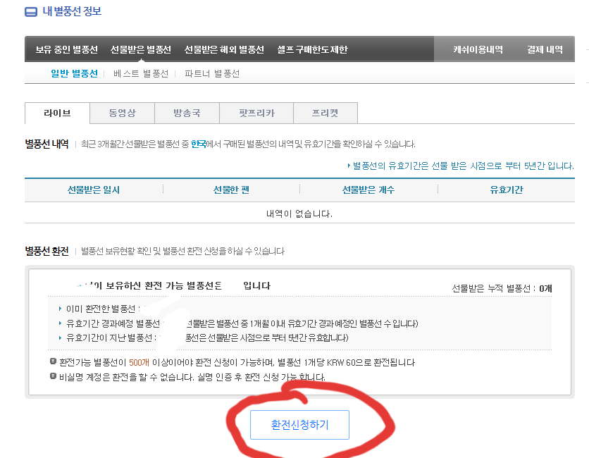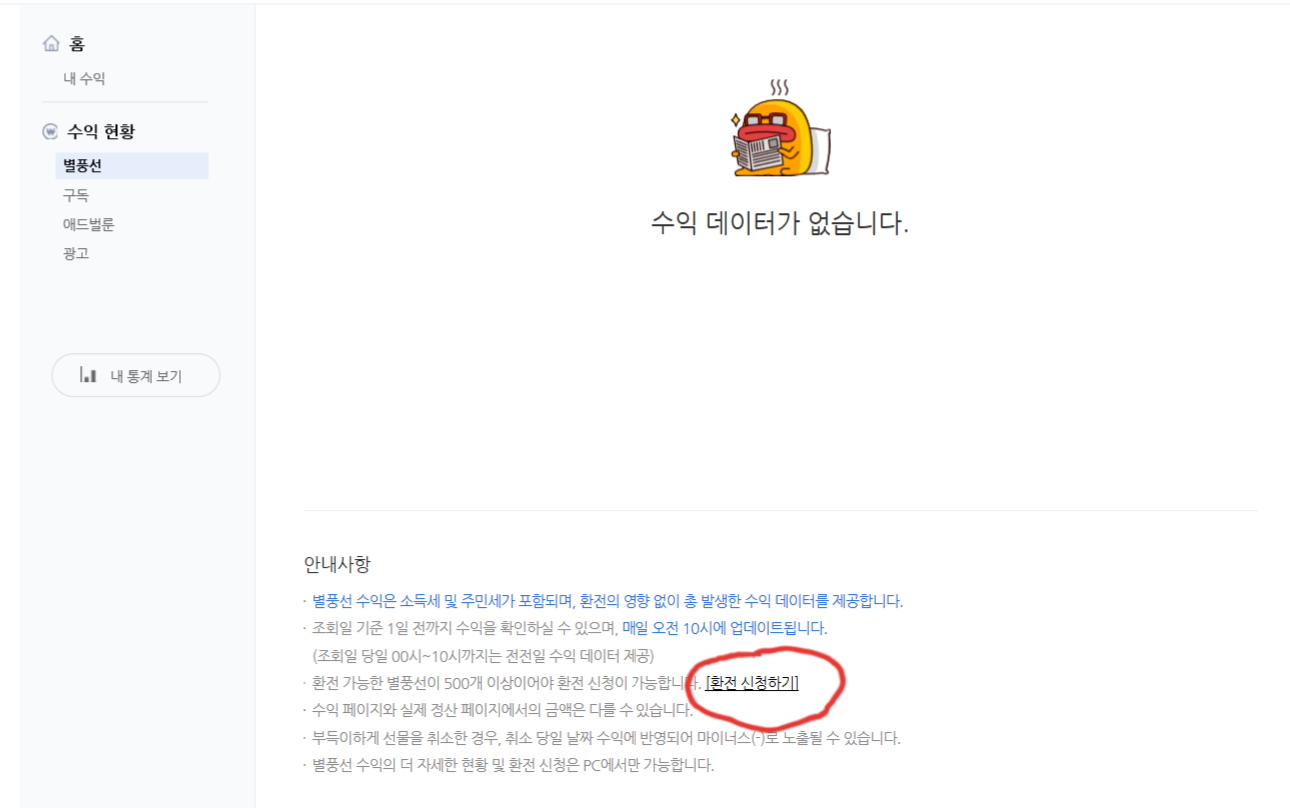 별풍선 환전할 때 스마트폰 앱으로는 안되고 PC 웹 사이트에서만 할 수 있습니다.