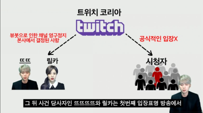 릴카측은 아무 이유 없이 영구정지를 당하고, 배틀그라운드 게임 방송을 하는 스트리머 뜨뜨뜨뜨 또한 불법 프로그램 사용이라는 근거 없는 이유로 영구 정지를 당하면서, 트위치의 무단 영구정지 약관이 논란이 되기 시작했습니다.