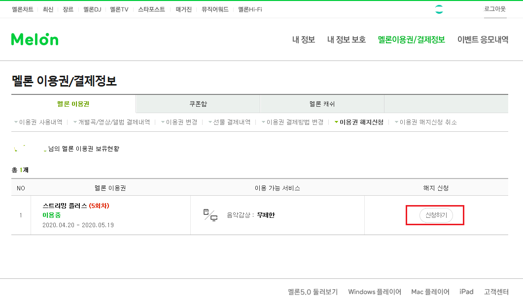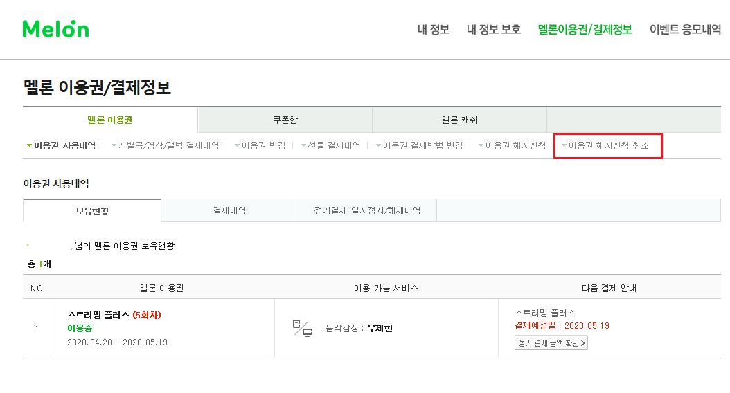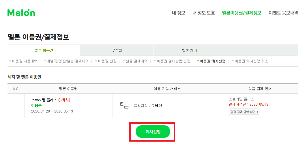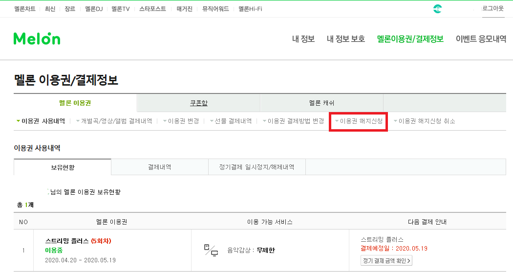 4. 멜론 이용권/ 결제정보에서 빨간색 네모칸 이용권 해지 신청 클릭 후